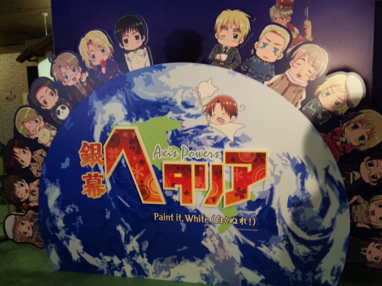 そして参加特典? キャラたちの真ん中に入って写真が撮れちゃいます☆ ポジションはまさかの菊と朝の間! そしてそして食べました! 『イギリスのフィッシュアンドチップス』 いやー、メニュー名が全部すごかった。 『"日本の露天風呂に入るイギリス"プリン』 『"勝手にひらがな作んなッある!!"ケーキ』などなど。 メニューの名前だけ見たらどんな料理か全然分からないというww